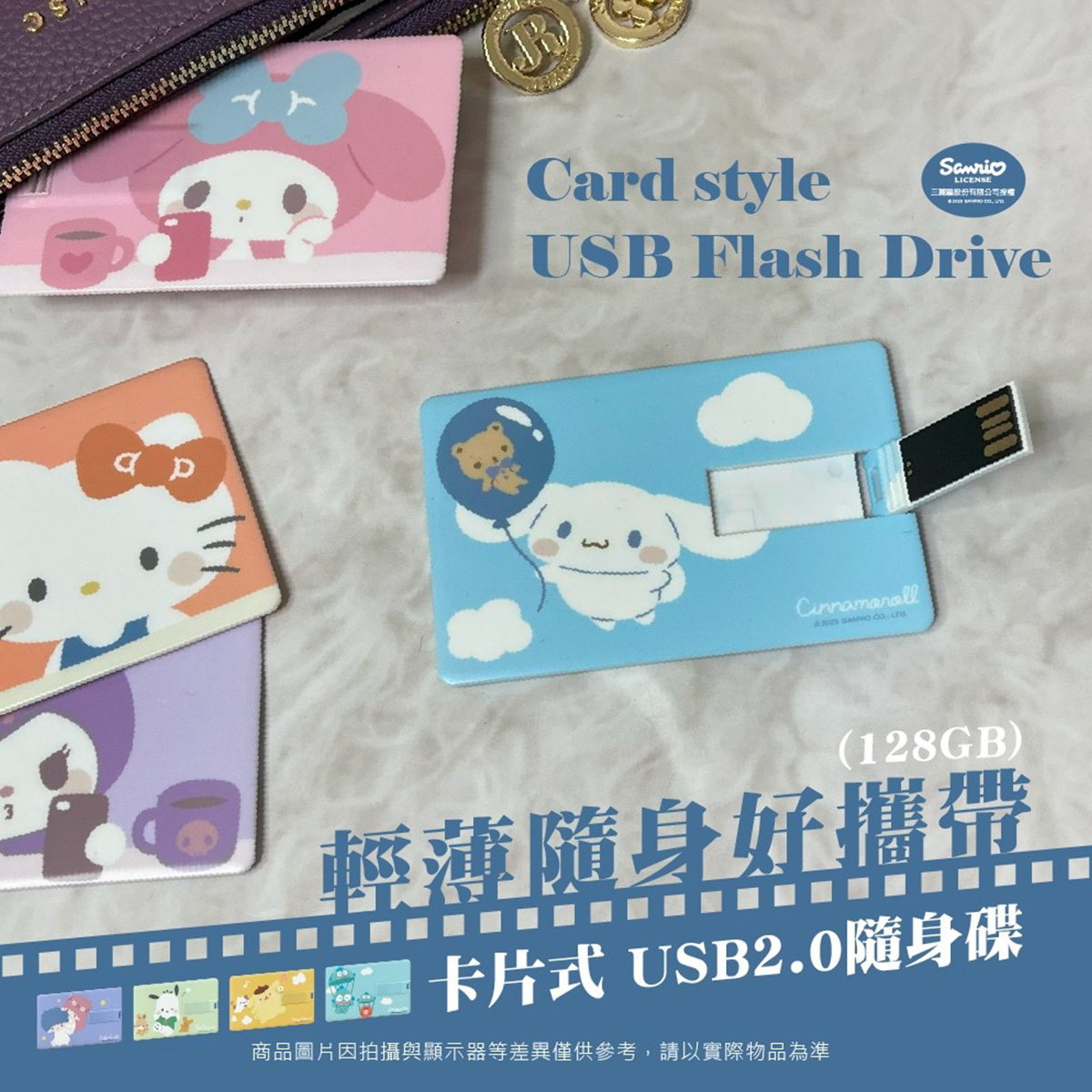128G卡片式USB隨身碟-三麗鷗 SANRIO 正版授權 【款式】KITTY/大耳狗/酷洛米/美樂蒂/人魚漢頓/布丁狗/帕恰狗/雙子星 【尺寸】8.5x5.5cm ±5% 【材質】PP塑膠、晶片 【產地】中國(台灣監製) *額定電壓:100-240V *額定頻率:50/60Hz *總額定消耗功率:90W