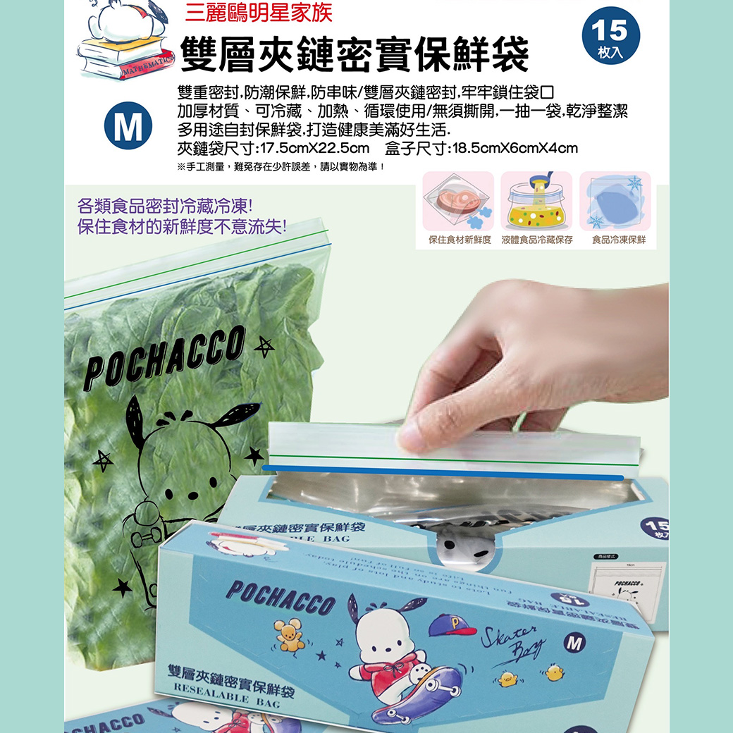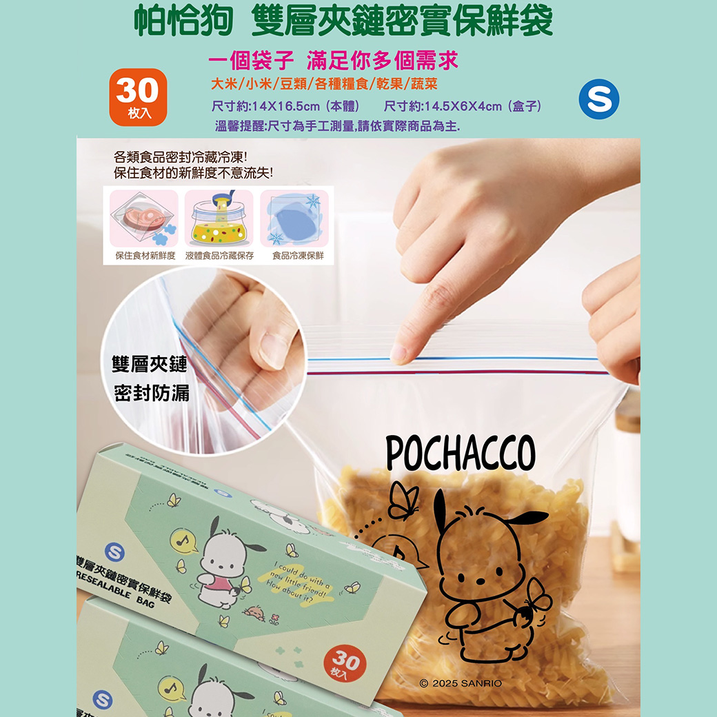 食物夾鏈袋-帕恰狗 三麗鷗 SANRIO 正版授權 【款式】小-S / 大-M 【內容】S-30入 / M-15入 【尺寸】小:約14x16.5cm/大:約17.5x22.5cm 【材質】LPDE(低密度聚乙烯) 【耐熱溫度】-10~60℃ 【產地】中國(台灣監製)