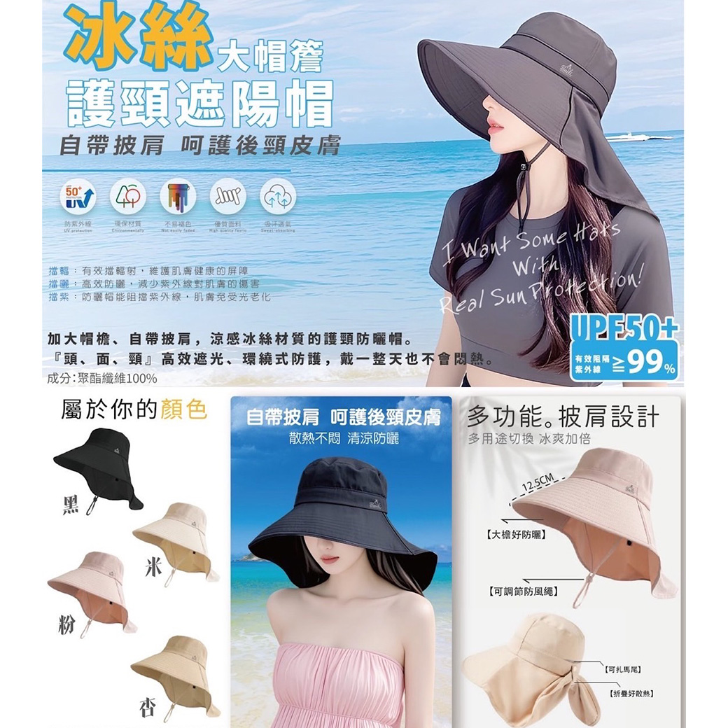 冰絲 寬帽沿 護頸披肩 防曬遮陽帽 四色