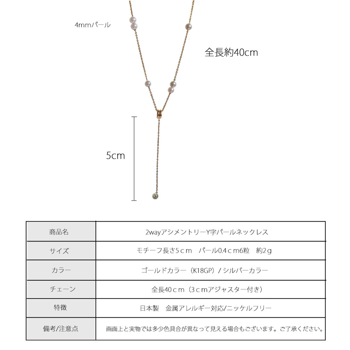 預購-日本製 Melody Accessory 2WAY Y字珍珠項鍊 【款式】金色(K18鍍金)/ 銀色 【尺寸】人造珍珠:0.4cm、總長:40cm(含3cm調整環) 【產地】日本 ▲▲預購商品須知 *請勿跟現貨商品一起下標,麻煩分開下單。 *結帳時請勿選擇超商取貨付款。 *預購商品需3~4週左右的工作天,可以等待再下單,謝謝。