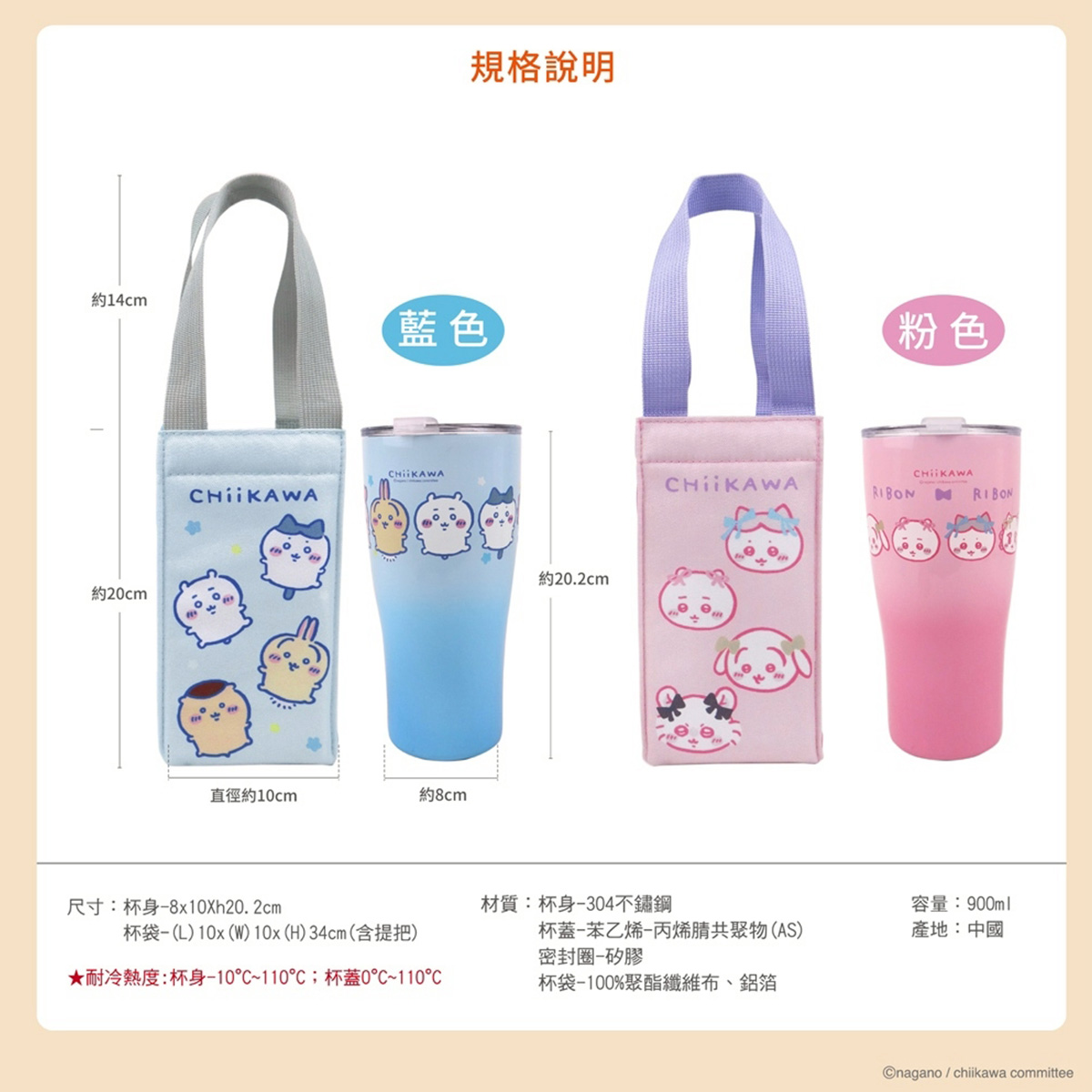 冰壩杯900ml附保溫提袋-吉伊卡哇 CHIIKAWA 正版授權 【款式】藍/粉 【內容】冰壩杯*1 + 保溫提袋*1 【容量】900ml 【尺寸】如圖所示 【材質】杯子:304不鏽鋼、杯蓋:AS/苯乙烯、密封圈:矽膠、杯袋:聚酯纖維布、鋁箔 【產地】中國(臺灣監製)