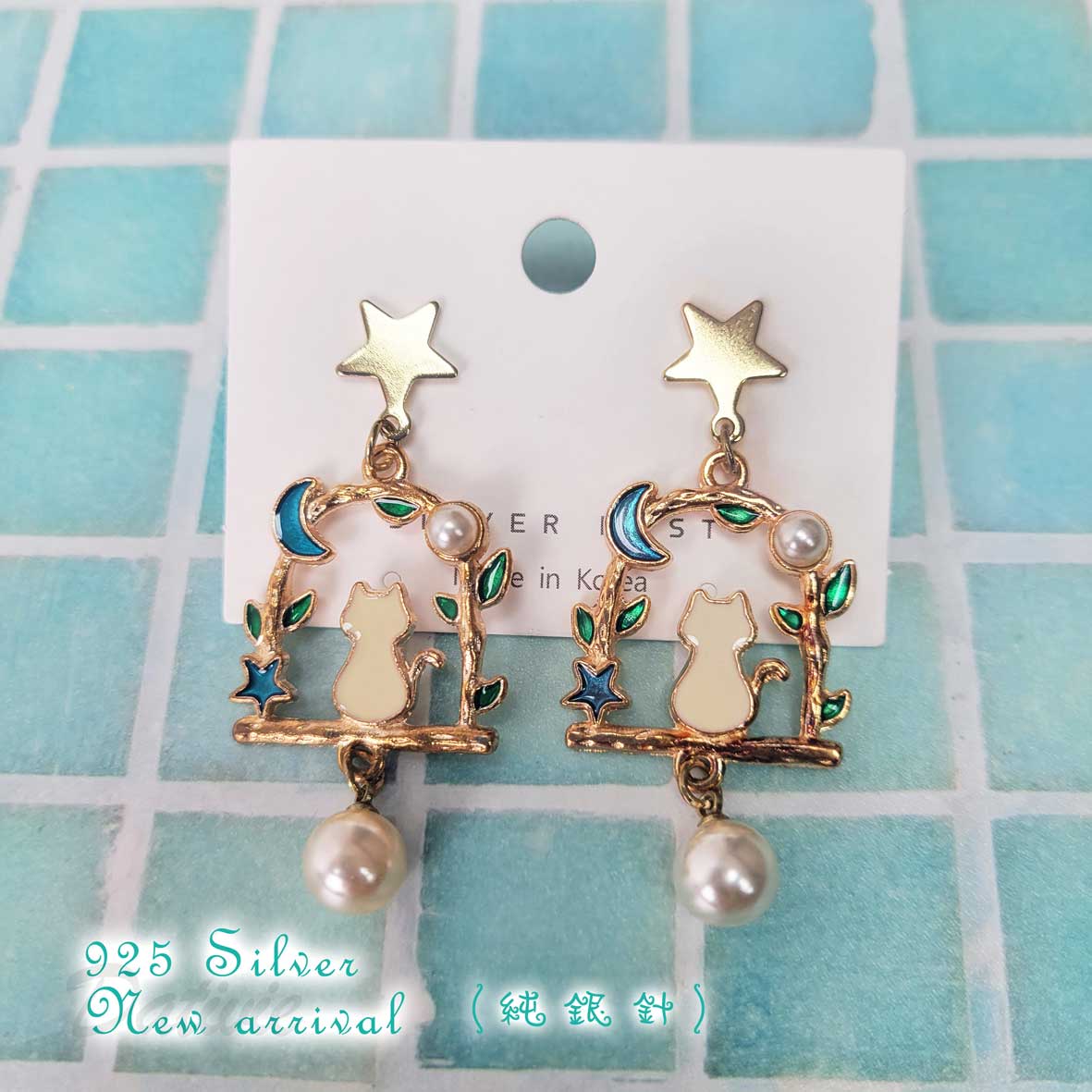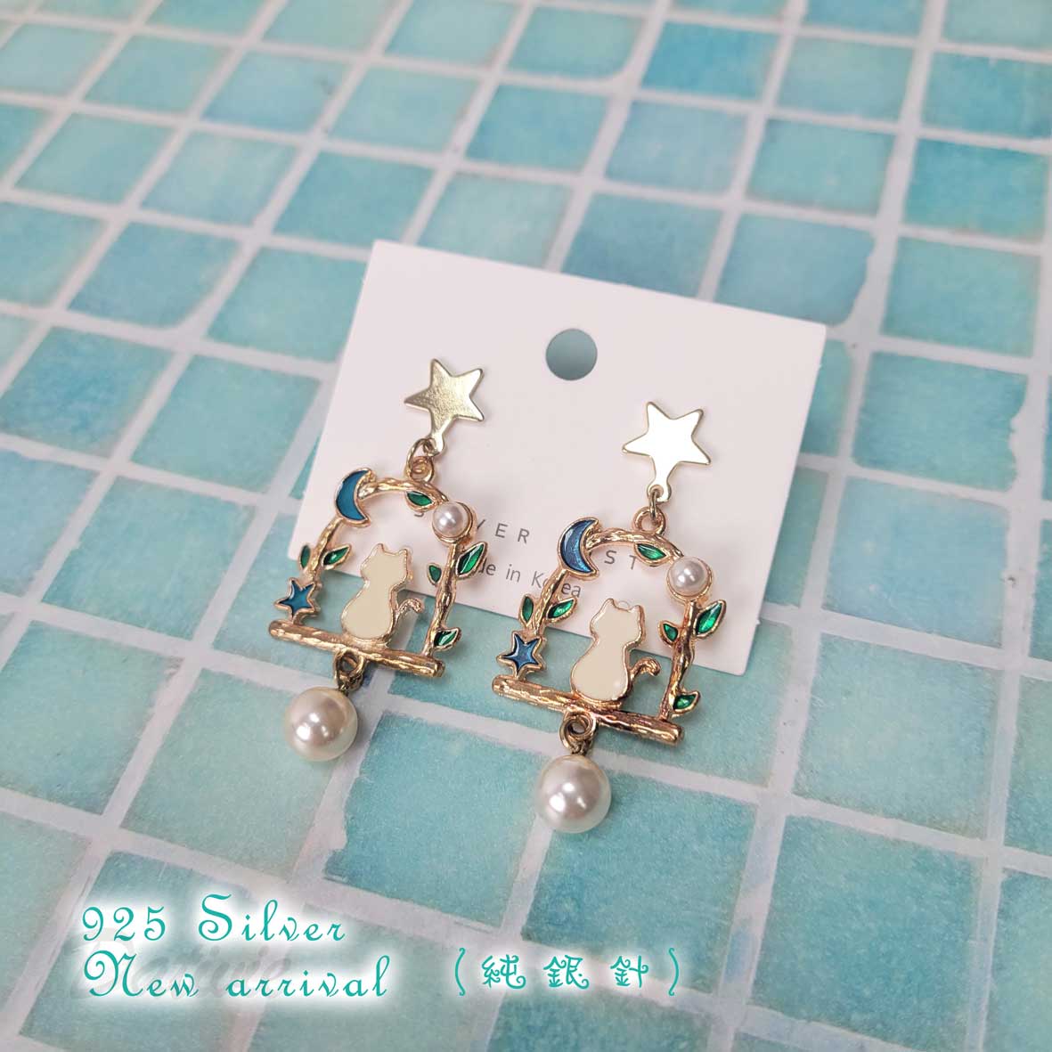 流行 可愛 貓咪 珍珠 星星 造型 垂墜 耳環